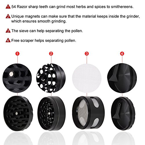 HEAVY GRINDER With Powerful Rare Earth Magnets - Keep The Lid In Place, Your Herbs Fresh And The Odors In The Grinder. MICRON MESH to filter out the purest pollen and FREE SCRAPER included. Our thin Poly O-Ring Guarantees Smooth Grinding.