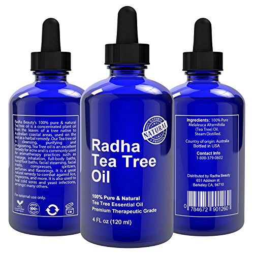 -. Binding : Misc. -. Brand : Radha Beauty -. EAN : 0784672901260 -. Feature : 100% PURE & NATURAL TEA TREE ESSENTIAL OIL - Produced through steam distillation of fresh leaves. Unfiltered and undiluted with no fillers or additives. / VERSATILE ESSENTIAL OIL / DILUTE FOR BEST RESULTS- Always dilute this powerful essential oil. Great to mix with carrier oils such as Radha's Fractionated Coconut Oil. Diffuse for a pleasant aroma. / NATURAL ANTISEPTIC - Detoxifying and cleansing with anti-fungal properties. / RISK-FREE MONEY BACK GUARANTEE - If you are not completely satisfied, simply contact us and we will give you a full refund, no questions asked! -. IsAdultProduct : 0 -. IsAutographed : 0 -. Label : Radha Beauty Products LLC -. Manufacturer : Radha Beauty Products LLC -. Model : Tea Tree Oil -. MPN : B00VKHKH8C -. PackageQuantity : 1 -. PartNumber : B00VKHKH8C -. ProductGroup : Beauty -. ProductTypeName : BEAUTY -. Publisher : Radha Beauty Products LLC -. Size : 4 Ounces -. Studio : Radha Beauty Products LLC -. Title : Tea Tree Essential Oil 4 oz - 100% Pure Therapeutic Grade -. UPC : 784672901260