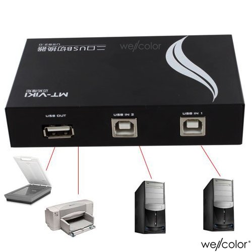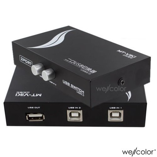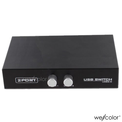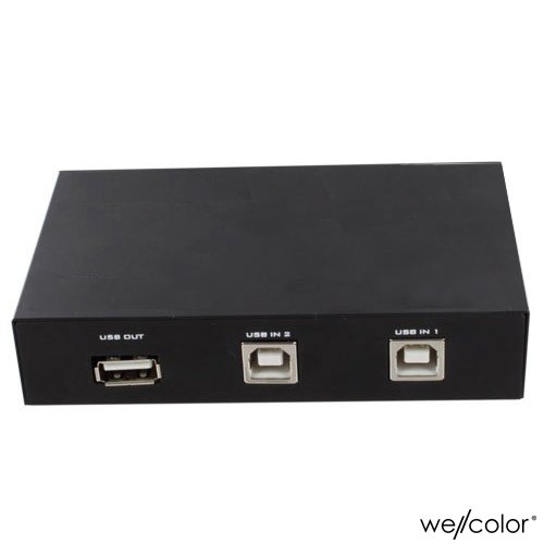 The 2-port manual sharing switch box, allows 2 computers access to one single USB compliant device ( such as printer, scanner, external hard drive, projector, camera, keyboard with USB-A interface , each button to control each port.