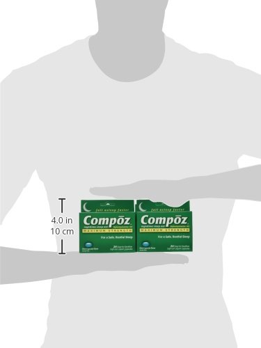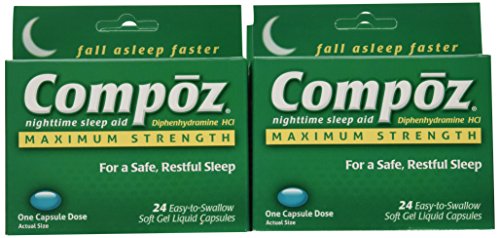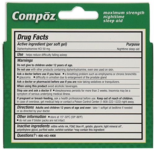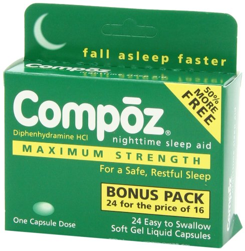 -. Binding : Health and Beauty -. Brand : Compoz -. EAN : 0375137212153 -. Feature : Compoz is a sleep aid designed to relieve occasional sleeplessness. / Active Ingredient: Diphenhydramine HCI / Safe for Adults and children 12 years and older / For a safe, restful sleep -. Label : Compoz -. Manufacturer : Compoz -. NumberOfItems : 6 -. PackageQuantity : 6 -. ProductGroup : Health and Beauty -. ProductTypeName : HEALTH_PERSONAL_CARE -. Publisher : Compoz -. Studio : Compoz -. Title : Compoz Nighttime Sleep Aid, Maximum Strength, Soft Gel Liquid Capsules, 24 Count (Pack of 6) -. UPC : 375137212153