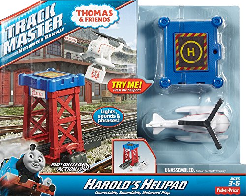 -. Feature : Accessory pack includes Harold, helipad, track base with brake-track, and cargo piece / Cargo piece can hook to the bottom of Harold / Press the helipad to activate lights, sounds, and phrases / Includes over 10 sounds and phrases / Track base connects to TrackMaster track (additional track sold separately and subject to availability)