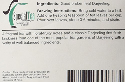 -. Binding : Grocery -. Brand : Special Tea -. EAN : 0852667690335 -. Feature : Loose Leaf Tea / Makes approximately 200 cups of tea / Each packet is hand packed in the USA. / Premium tea leaves have all their essential oils intact, so the flavor, quality and health benefits are maintained. -. Label : Special Tea -. Manufacturer : Special Tea -. NumberOfItems : 1 -. PackageQuantity : 1 -. ProductGroup : Grocery -. ProductTypeName : GROCERY -. PublicationDate : 2014-06-29 -. Publisher : Special Tea -. ReleaseDate : 2014-06-29 -. Size : 16 Ounce -. Studio : Special Tea -. Title : Special Tea 1st Flush Darjeeling Loose Tea,Risheehat, 16 Ounce -. UPC : 852667690335