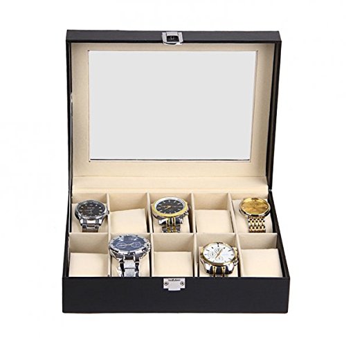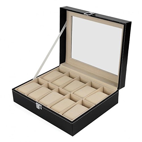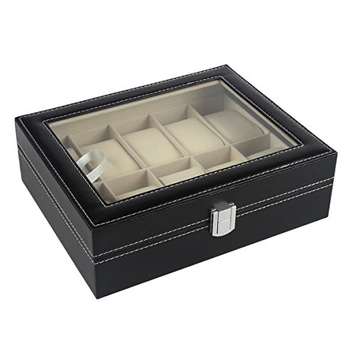 -. Title : Aketek Watch Box 10 Mens Black Leather Display Glass Top Jewelry Case Organizer