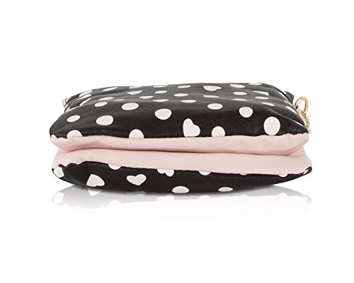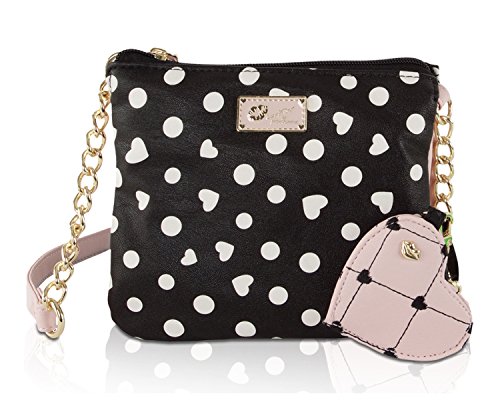 Compact and neat, This Luv Betsey Dome Double Crossbody Pouch Bag Features; PVC Dotted print exterior with signature logo, top zip closure, hanging signature keychain, fully lined Interior, enough space to fit your, wallet , keys and couple small items. This bag will become your "go-to" bag for running errands. Cross-body strap offers security while wearing, double styling and fun!Feature