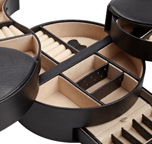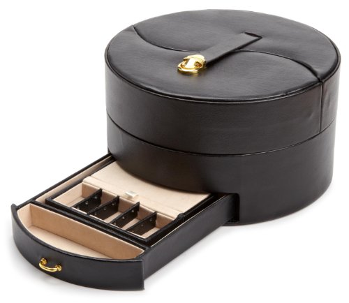 -. Binding : Kitchen -. Brand : WOLF -. Feature : Smooth faux leather exterior in black / Multi-compartment case with ring rolls and earring holders / 2 swing out compartments and 1 drawer / Plush padded lining / Dimensions: 8W x 8D x 4.5H in. -. Label : Wolf Designs Inc -. Manufacturer : Wolf Designs Inc -. MPN : 280702 -. PackageQuantity : 1 -. PartNumber : 280702 -. ProductGroup : Home -. ProductTypeName : HOME -. Publisher : Wolf Designs Inc -. Studio : Wolf Designs Inc -. Title : WOLF Heritage Chelsea Black Jewelry Case - 8W x 4.5H in.
