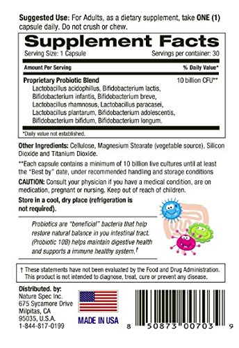 ReleaseDate : 2017-02-01 Studio : Wintec Industries Publisher : Wintec Industries Binding : Health and Beauty Product Description RELIEVES DIGESTIVE ISSUES FAST: If you suffer from gas, bloating, digestion problem, constipation, or bacterial overgrowth, and other NS 10B PROBIOTIC SUPPLEMENTS CONTAIN 10 DIFFERENT SPECIES: Prebiotics are specialized plant fibers that nourish the good bacteria that live in your stomach. Research reveals prebiotics, like Bifidobacterium bifidum, promotes a healthy digestive system. NS 10B Probiotics have 10 species that may help for several chronic digestive disorders or inflammatory bowel disease. SUPERIOR POTENCY AND EFFECTIVENESS: Studies show that without the protection of being enteric coated, most probiotics won t survive the harsh environment of the stomach or even outside. In that case, they are often ineffective in relieving your digestive issues. NS 10B Probiotics uses vegetarian resistant capsules which guarantee the delivery of live probiotics to your gut. As a result, they will be able to travel throughout your entire digestive system, repopulating your gut with healthy and good bacteria. THE BEST QUALITY PROBIOTIC MONEY CAN BUY AND MADE IN AMERICA: GMP Quality Assured. The high quality of manufacturing process keeps the probiotics alive for longer, increasing shelf life. Equally Perfect for Men or Women. Get the digestive advantage now! 0