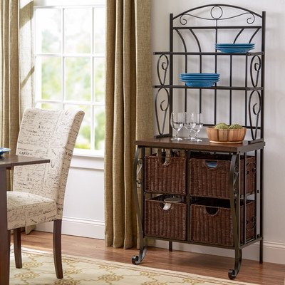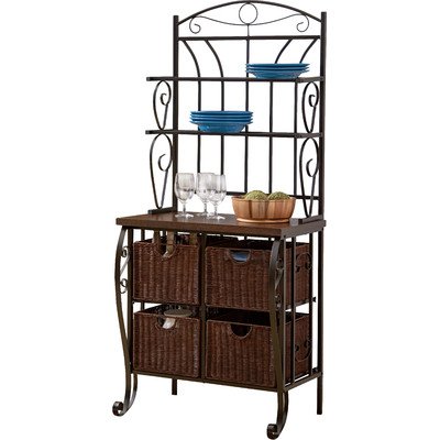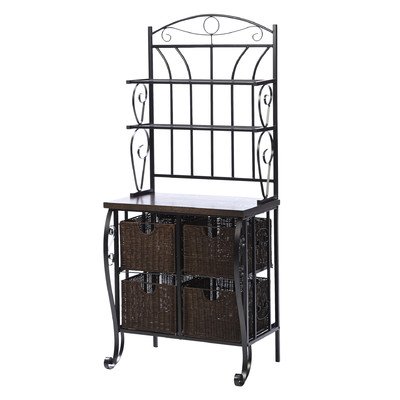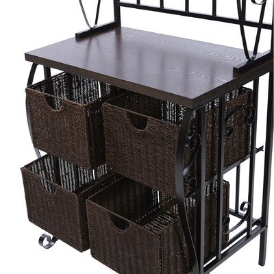 Product Description Create a rustic craft station in the den or unconventional home bar with this lovely baker's rack, featuring an eye-catching openwork design with scrolling details and 4 pull-out basket drawers. 0