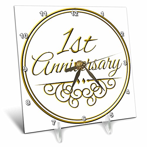 1st Anniversary gift - gold text for celebrating wedding anniversaries 1 first one year together Desk Clock is a wonderful complement to any room in your home or office. Made of durable high grade aluminum. This frameless clock has a high gloss mirror like, UV coated, scratch resistant finish and is suitable for a moist environment. Measures 6" x 6" and requires one AA battery; not included. Battery box is not covered.Feature