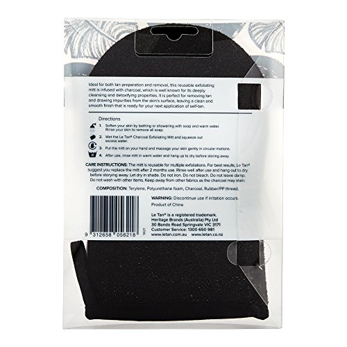 Ideal for both tan preparation and removal, this reusable Exfoliating Mitt is infused with charcoal, which is well known for its deeply cleansing and detoxifying properties. It is perfect for removing an and drawing impurities from the skin's surface, leaving a clean and smooth finish that is ready for your next application of self-tan. All Le Tan products are free from oxybenzones Great for tan preparation and drawing impurities from the skins surface to leave a clean and smooth finish!Feature