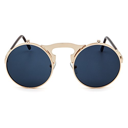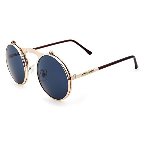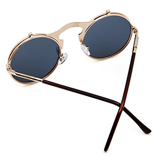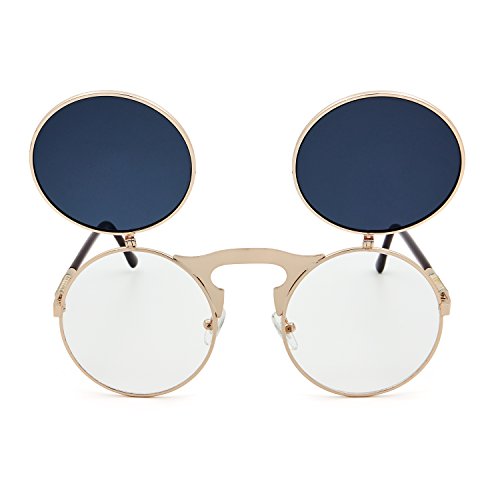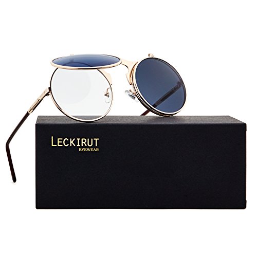 Leckirut Women Men Round Sunglasses Steampunk Sidestreet Flip-up Mirror Lens Metal Frame Eyewear