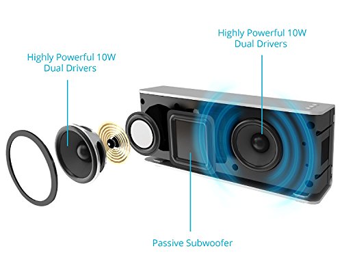 -. Feature : HIGH QUALITY CRYSTAL CLEAR SOUND: Distinct mids and highs from our two precision acoustic drivers delivering 20 Watts of excellent stereo sound and enhanced bass from our proP.R.Ietary passive subwoofer design. / COMPACT AND PORTABLE: It goes where you go: outdoor and indoor. Plays non-Bluetooth devices through 3.5mm Aux in Jack adapter(included). Ideal for chilling out at the beach, hitting the gym, or use it while relaxing at home. / BLUETOOTH 4.0 & NFC: Latest Bluetooth for wide compatibility (All iPhones, iPods and Android Phones), long range (upto 33 feets away), connects automatically with last used phone or tablet. NFC for easy pairing with NFC enabled phones. No code/pin needed to pair. / 6 HOURS MUSIC or SPEAKERPHONE: Intuitive built-in mic and dedicated control buttons for 6 hours of wireless music streaming (at 50% volume, 2500mAh battery) and/or crystal clear hands-free talking (Noise and echo cancellation using Advance Codec IC) call management from up to 33 feet of remote distance with free clear line of sight. / Model SP103 INCLUDES: 1 X AudioFlow BigBass, 1 X 3.5mm Aux-in Adapter Cable (3.3 ft), 1 X micro-USB cable (3.3 ft), User manual and Warranty Card. Comes with 1 Year Hassle Free Warranty.