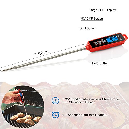 【FAST READING】5.35" long food grade stainless steel probe with Step-down Tip and Large LCD Screen design ensuring an ultra-fast 4-7 seconds response time