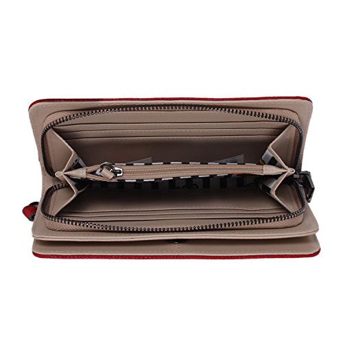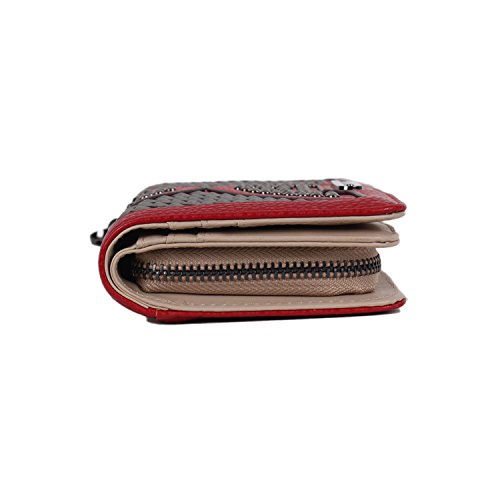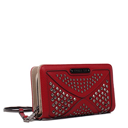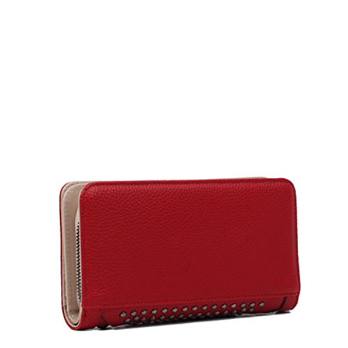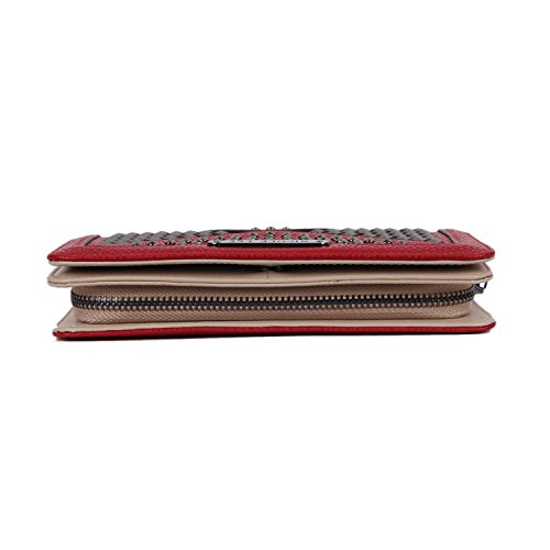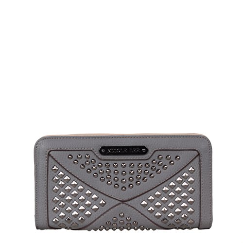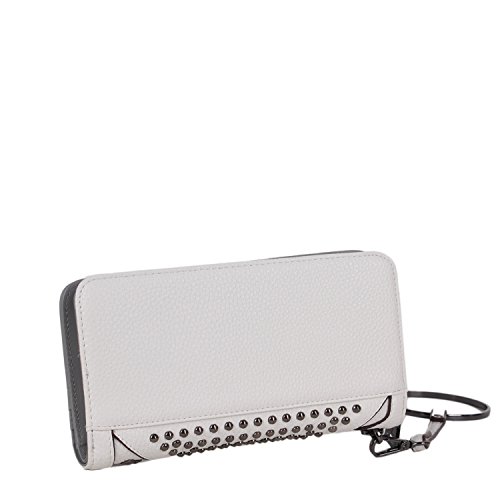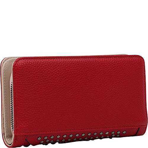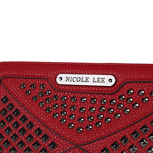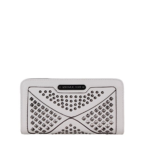 Studio : Nicole Lee Publisher : Nicole Lee Binding : Apparel Product Description Add a bit of utilitarian attitude to any outfit on the go with the Sanne Rockstud Wallet. Exterior Features: Polished multi-studs and furnished with gunmetal-tone hardware detailing. Made of pebbled faux-leather, zipper closure with NL monogrammed zipper pull, magnetic snap button closure, detachable faux leather wristlet and Nicole Lee nameplate on front. Interior Features: Flap closure includes two ID windows, six credit card sleeves, and two receipts sleeves. Zipper compartment featiures eight receipt sleeves, middle coin zipper pocket with NL Pop Stripe print logo nylon lining. Gunmetal-tone wrislet has a 3.5" inch drop. Color available are Black, White, Red, Grey. For cleaning, wipe with damp cloth. 0