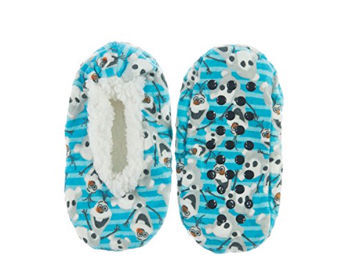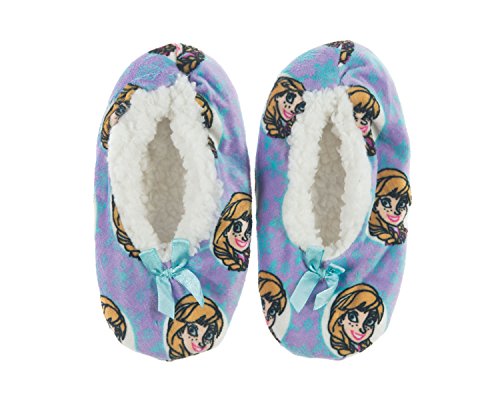 For the first time in forever, Girls can stay warm in these adoarable Disney Frozen character fleece-lined slippers. Watch your favorite princess dance around with her friends Elsa,Anna and Olaf in these colorful, slip resistant shoes. Made with plush sherpa fleece lining that is 100% Polyestester. Available in sizes S/M (kids 8-13) and M/L(kids 13-4)Feature