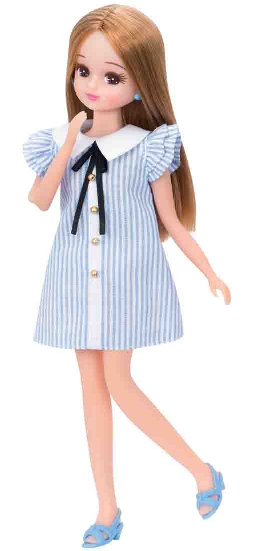 爽やかですっきりとした水色の、袖フリルのシャツワンピースを着たリカちゃんです。