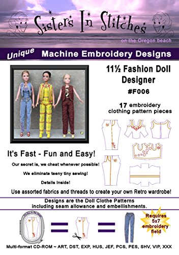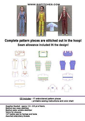 Studio : Sisters In Stitches Unique Embroidery Publisher : Sisters In Stitches Unique Embroidery Binding : Toy Product Description Create Designer Style Pants, Tops and Vests for the 11½" Doll with your embroidery machine. The embroidery designs ARE the complete garment pattern pieces, including seam allowance and embellishments. You select the fabric and the threads to stitch out your customized pattern pieces. Cut them out along the line and sew the pieces together with a standard sewing machine. Facings and hems (those tiny parts) are fused down, not sewn! Designer Jeans, Plaid and Squiggle styles with matching vests and tops. Printable PDF file on the CD with detailed step by step instructions. Multi-format CD. Requires 5x7 embroidery field. 0