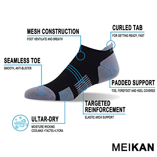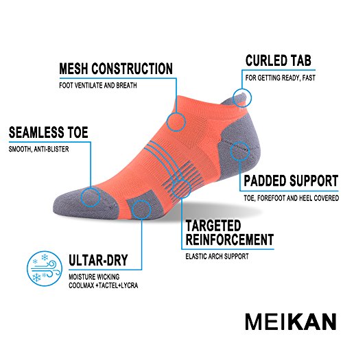 -. Binding : Apparel -. Brand : MEIKAN -. Department : mens -. Feature : MOISTURE WICKING: MEIKAN Low Cut Running Socks are made of moisture wicking Coolmax fabric and designed with breathable mesh ventilation construction to wick sweat away from your skin, prevent foot fungus, and keep you feet cool and dry during sports and exercise. / SOFT CUSHIONING: Extra padding on the toe, metatarsal and heel provides abrasion protection and soothes aching muscles. / ARCH SUPPORT: The elastic arch support further minimizes friction and produces a fantastic sense of stability and control in your stride. / ANTI BLISTER: The heel tab protects your Achilles' tendon from injury due to shoe friction. The smooth and seamless toe ensures no slipping and no blisters. / BEST RUNNING SOCKS FOR MEN & WOMEN: The cushioned low cut style fits comfortably with any running shoes, for example, Air VaporMax Flyknit, Zoom Fly, Free RN Flyknit, Boost Running Shoes, etc. It's one of the best gift choices for Holiday, Festival and Anniversary! -. Model : MK-017 -. ProductGroup : Apparel -. ProductTypeName : SOCKSHOSIERY -. Title : Low Cut Running Socks MEIKAN Athletic Coolmax Tab Socks for Men & Women 1,3,6 Pairs