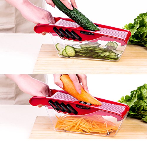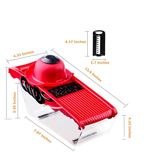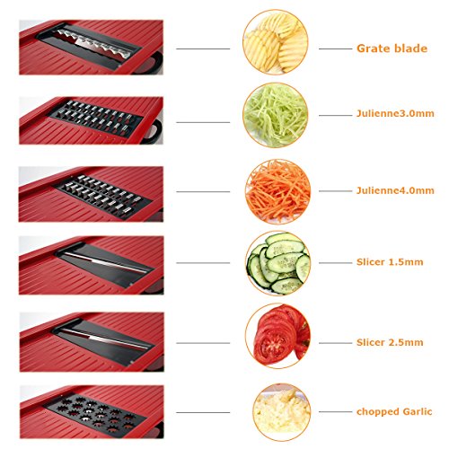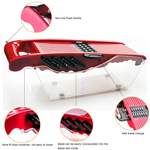 Mandoline Slicer Vegetable Grater & Julienne Slicer Cutter With 6 thicknesses Interchangeable Stainless Steel Blades Food Container and Peeler Red