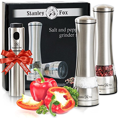 Premium Salt and Pepper Grinder Set of 3, Brushed Stainless Steel Salt and Pepper Shakers - Pepper Mill and Salt Mill -Adjustable Ceramic Rotor - Oil Sprayer and Gift Box by Stanley Fox