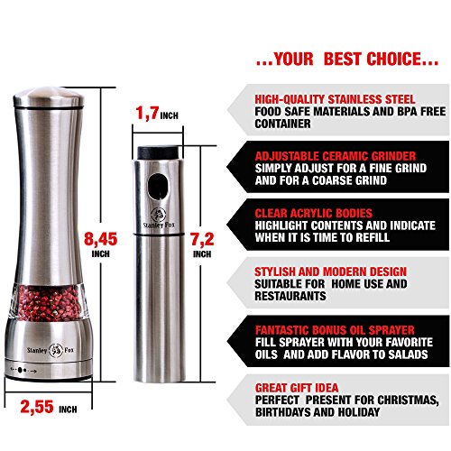 ★ INNOVATIVE DESIGN AND GREAT GIFT IDEA: Our premium stainless steel pepper mill set and oil sprayer from Stanley Fox are a must - have for every home. Our product comes in a premium quality gift-box and therefore is an ideal gift for holidays, birthdays or Christmas.