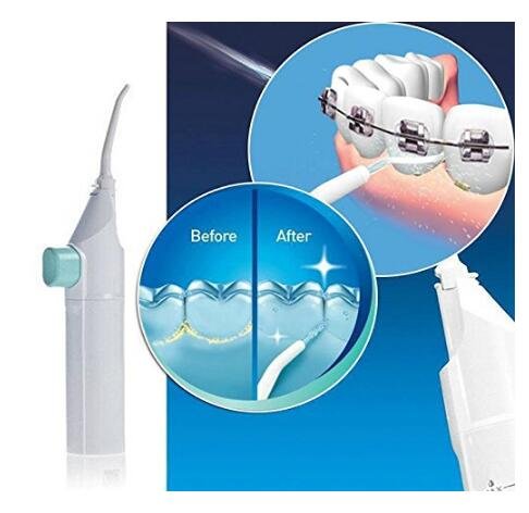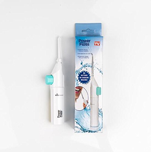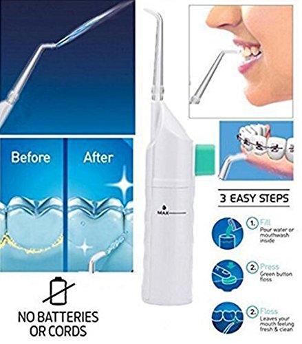 Features: Don't be afraid of your next trip to the dentist.Practicing good oral hygeine at home has never been easier. Flossing is one of the most important elements in taking care of your teeth, but so many people hate the painful task. you can gently remove plaque causing debris and clean those hard-to-reach surfaces, all with this pain-free device. Just fill with water, point, and press to power. The air infusion technology gently blasts away unwanted particles and flushes out crevices for healthy teeth that are sure to please your dentist. You can also fill the with mouthwash to freshen as you floss. The ergonomic design and low profile tip helps reach the back teeth and is perfect for keeping braces, bridgework or other dental work clean. Never again worry about getting floss stuck between teeth or dealing with the pain of flossing. Get fast, easy and pain-free results. No batteries or cords This is powered by air Ideal for braces, crowns, sensitive gums and other dental work 0