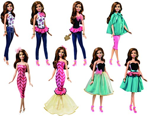 With this pack of mix-and-match pieces, the fashion fun and storytelling possibilities are endless! Barbie doll comes with 10 versatile pieces that can be combined in so many different ways -- you can create more than 20 different looks! Barbie doll wears a graphic top and beautiful skirt that doubles as a cape, with amazing accessories that include one pair of fabulous shoes, a bracelet and a pair of dazzling earrings. Have something different in mind? Then switch up her outfit. She comes with additional clothing options, such as a trendy pair of "denim" pants, a fabulous dress with sparkle and a sheer overskirt. Each pack also includes a fancy bow, trendy ruffle, unique bag and a second pair of shoes. Go from day to night, casual to glam. Collect both sets for even more mix-and-match fashion fun. Set includes Barbie doll with 10 fashion pieces that include a reversible top, skirt, one pair of pants, a skirt/cape, one dress, one ruffle, one bow, one bracelet, one purse and two pairs of shoes. Each sold separately, subject to availability. Doll cannot stand alone. Colors and decorations may vary.Feature