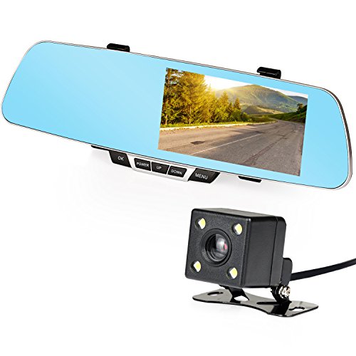 -. Feature : Perfect Dual Lens Integration:With our Dual Lens Car Camcorder,your car will have an camera with a front lens and a waterproof rearview lens,5.0 inch rearview anti-dazzling mirror.With one button, you can switch quickly between front view, rear view and picture-in-picture display. / Loop Recording Function: This function ensures continuous recording without missing a second,record automatically during vehicle ignition, switch off automatically with ignition off to get you free from the hands operation. / G-Sensor Function:You can choose the sensitivity freely,when you have an emergency brake, the car camera will automatically save and lock this video.The locked video may help to avoid unnecessary traffic matters. / Parking Guard: When you leave you car and turn on this function,the camera will start up to record and lock the file to save as evidence when your car is shocked by external force collision. / More Features:For better using experience, one more USB port is built in the car charger so that the phone can be also charged when camera is recording. Other features like motion detection, reversing visual function,time setup,and microphone/speaker are also available .All these functions can let you enjoy you car driving on the way safely and comfortably.