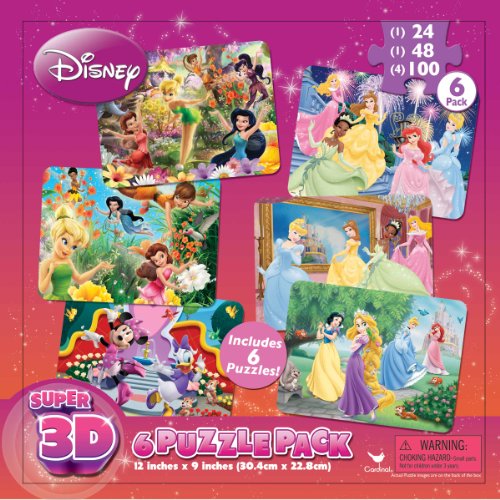 -. Binding : Toy -. Brand : Disney -. EAN : 0047754415063 -. Feature : Your favorite Disney characters / 6 Puzzles in 1 Pack: 2 puzzles have 24 pcs, 2 puzzles have 48 pcs and 2 puzzles have 100 pcs / Super 3d means 30 layers of depth / Challenging and rewarding / Incredible graphics -. IsAdultProduct : 0 -. Label : Cardinal Industries, Inc. - Imports -. LegalDisclaimer : Choking Hazard - Small parts. Not for children under 3 years. -. Manufacturer : Cardinal Industries, Inc. - Imports -. Model : 41506 -. MPN : LYSB006R07848-TOYS -. PackageQuantity : 1 -. PartNumber : LYSB006R07848-TOYS -. ProductGroup : Toy -. ProductTypeName : TOYS_AND_GAMES -. Publisher : Cardinal Industries, Inc. - Imports -. Studio : Cardinal Industries, Inc. - Imports -. Title : Disney Girls 6PK 3D Puzzles -. UPC : 047754415063 -. Warranty : 1 year warranty against manufacturer defects