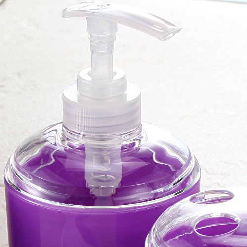 - Bathroom accessory set includes purple toothbrush holder, soap dispenser pump, purple soap dish, and tumbler