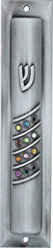Pewter Mezuzah Case with Colorful Gemstones "Hoshen" 12 Cm