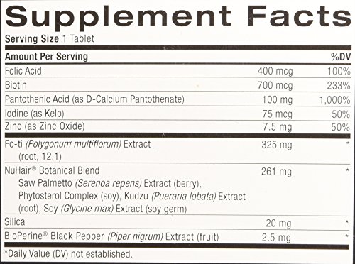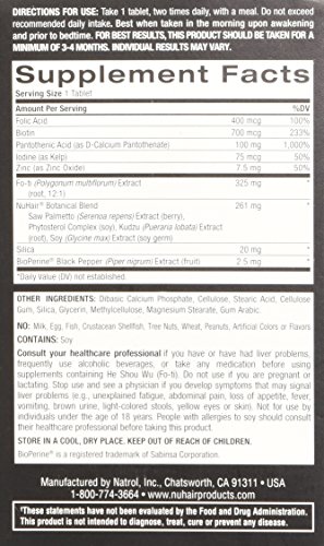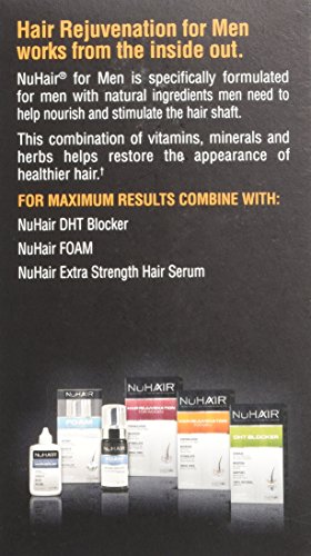 Natrol NuHair is America's #1 Selling Natural System for Hair Loss. NuHair supports follicular growth and thickens hair naturally. It helps to block the negative effects of DHT and delivers vital nutrients to nourish the scalp. Safe, effective and drug free, NuHair is a natural nutrient booster for fine and thinning hair. It energizes the scalp and nourishes the hair shaft to help produce stronger, thicker hair. NuHair has been specifically formulated with natural ingredients which possess DHT-inhibiting properties. As men age, rising levels of DHT can lead to hair loss and/or thinning hair. NuHair helps combat the primary type of hair loss in men by blocking the production of DHT. NuHair offers the number one, safe and effective natural supplement for hair loss. Thickens hair naturally. Energizes follicular growth. Provides intensive nourishment. Safe and effective for men. NuHair Hair Regrowth is a natural nutrient booster. Natrol makes this product in the U.S.A.!Feature