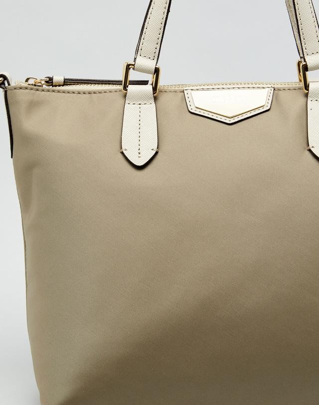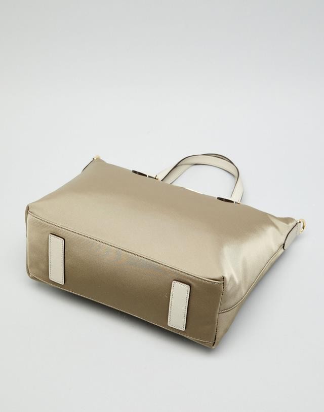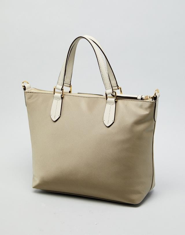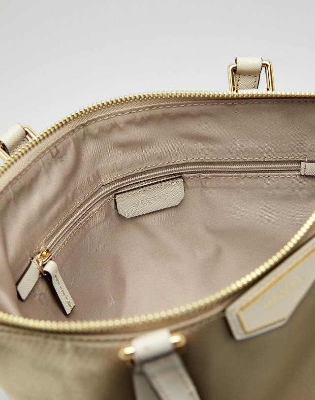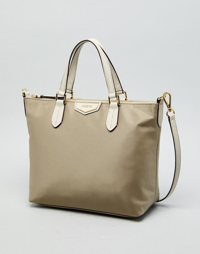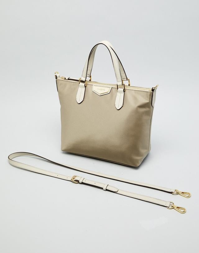 가죽을 배색하고 상단에 오각형의 로고 장식을 매치하여 포인트를 준 토트백입니다.