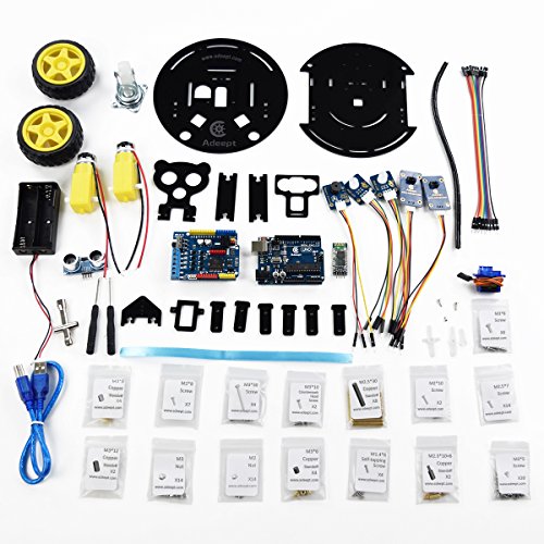 Adeept 3WD Bluetooth Smart Robot Car Kit is an educational and fun kit based on Arduino UNO R3 controller board, designed for both beginners and professionals to learn electronics, programming and robotics. With our easy-to-follow tutorial, assembling this robot car kit would be very intuitive and simple regardless of whether you are an engineer or a beginner. Building up your own robotic project has never been so easy and fun. Just follow our tutorial and step by step you will have your own running car kit within no time. This kit enables you to have a good quality time with your children and empower them to develop and inspire their imaginations. The Robot Car Kit has multiple working modes, such as remote control by Android APP, automatic obstacle avoidance, and line tracking modes. Download Tutorials: https://www.adrive.com/public/Z2Zsuf/Adeept_3WD_Bluetooth_Car-V1.0.zip Package List: 1 Set Acrylic Plates 1x Adeept Arduino UNO R3 Board 1x Adeept Motor Shield V2.0 1x Adeept Passive Buzzer Module 2x Adeept RGB LED Module 1x Ultrasonic Module 2x Adeept Line Finder Module 1x HC-06 Bluetooth Transceiver Module 2x Tires 1x Caster wheel 1x Servo 2x DC Motor 1x 18650 Battery case 1x Black tape 1x Wingding pipe 10x Jumper Wire M/F 3x 3-Pin Wires 2x 4-Pin Wires 1x Ribbon 18x M2 Nut 18x M3 Nut 10x M2*8 Screw 4x M2*10 Screw 16x M2.5*7 Screw 24x M3*5 Screw 10x M3*8 Screw 6x M3*30 Screw 10x M2.5*30 Copper Standoff 6x M3*6 Copper Standoff 6x M3*8 Copper Standoff 4x M3*12 Copper Standoff 4x M2.5*10+6 Copper Standoff 6x M1.4*6 Self-tapping Screw 4x M3*10 Countersunk Head Screw 1x Slotted Screwdriver 1x Cross Screwdriver 1x Cross Socket WrenchFeature