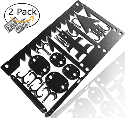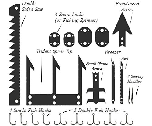 ★ CREDIT CARD SURVIVAL TOOL (2 Pack) ★ 22 multifunctional uses on 1 Wallet Sized Multitool Card! Survival Card Emergency Multitool has Multipurpose: Arrows for Survival Archery (small game arrow tips; broadhead, & spearing trident) barbed fishing hooks (size 4 & 6), Snare Locks, Tweezer, Sewing Needles & Awl. IDEAL FOR. for Camping, Preppers Gear Pack, Emergency SAS SHTF Survival Kit.