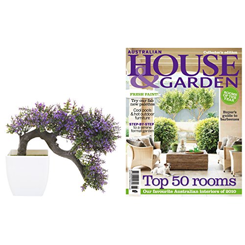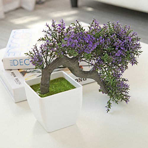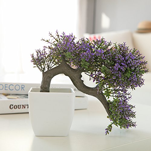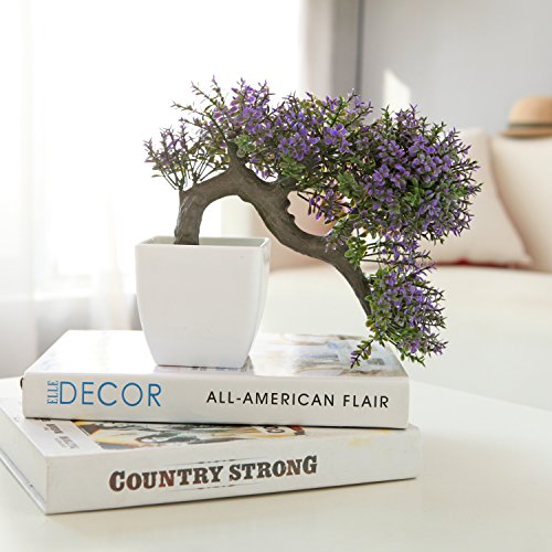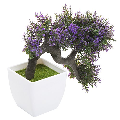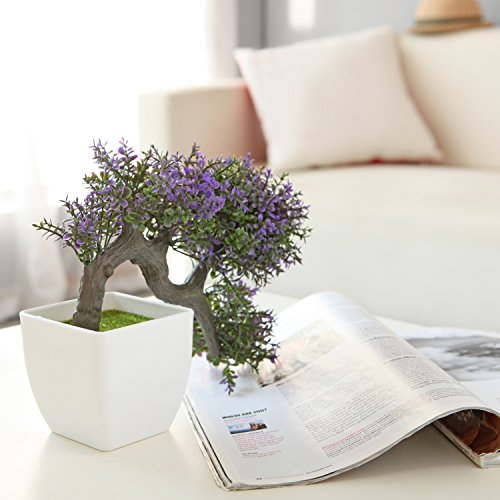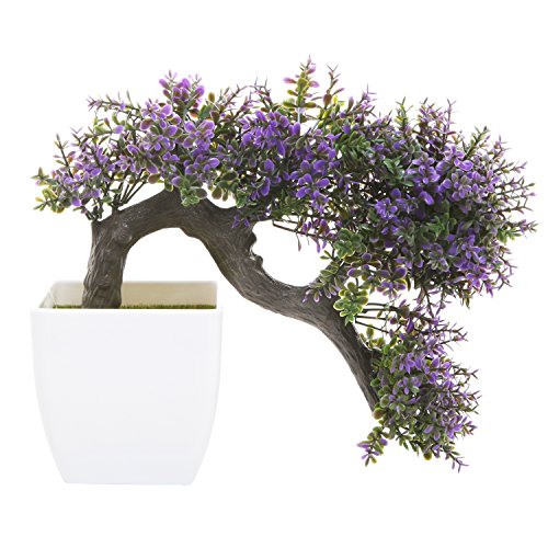 MyGift Purple Blossom Artificial Bonsai Tree, Faux Potted Plant w/ White Planter