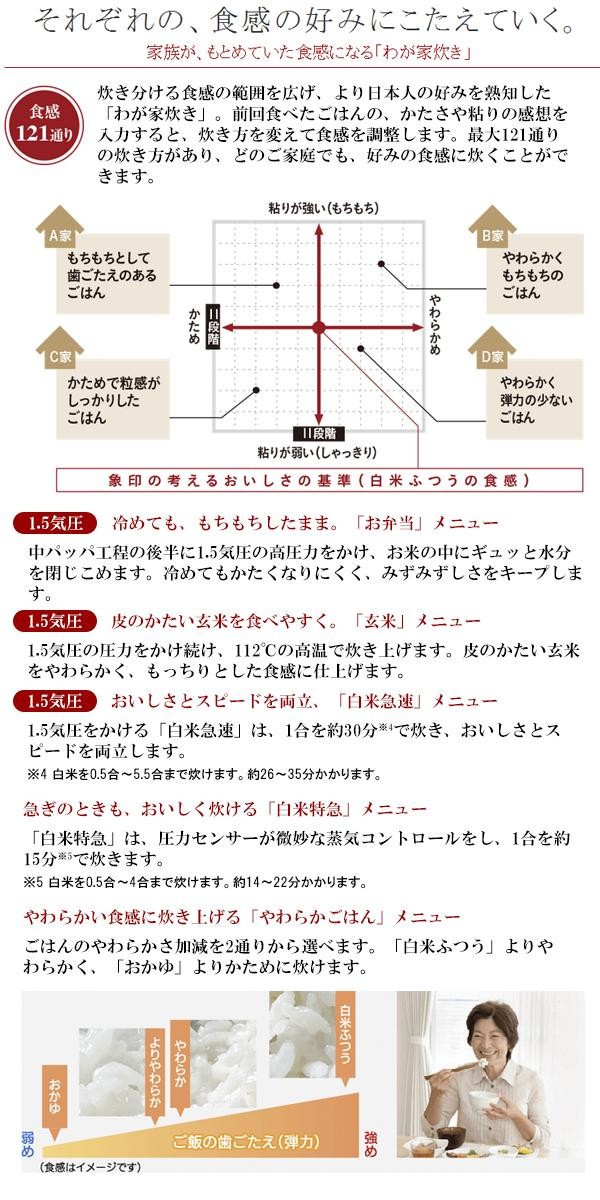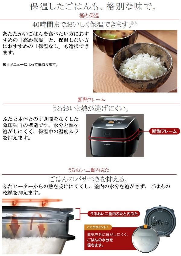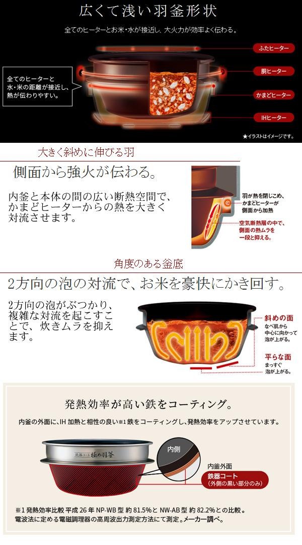 | 釜外側にIH加熱と相性の良い鉄をコーティングした『極め羽釜』採用。広くて浅い形状の釜は激しい泡の熱対流を起こし、釜の中の米をかき混ぜるので、しっかり熱が行き渡り、お米の一粒一粒がふっくら炊き上がります。 |