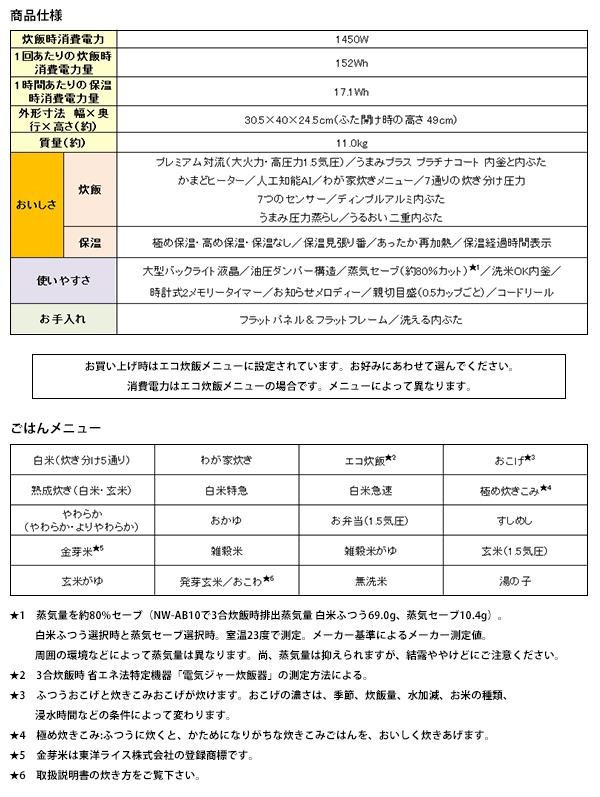 | 付属品 | しゃもじ、しゃもじ置き、計量カップ(白米用・無洗米用)、DVD、取扱説明書兼保証書(保証期間:1年間※内釜フッ素加工:3年間) ※取扱説明書に「お料理ノート」ページあり |