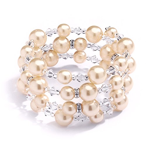 -. Feature : Mariell's HANDMADE Champagne Dark Ivory Color Glass-Based Pearl Wedding Bracelet Accented with Genuine Swarovski Crystal Beads and Rhinestone Rondelles; Mariell Couture Style Cuff for Brides, Mothers of the Bride, Bridesmaids or Formal Occasion; Glamorous Bold Pearl Wrap Around Bracelet From Our Luxe Wedding Jewelry Collection / Comfortable 3-Row Adjustable Pearl Bracelet with Easy On and Off Wear; Meticulously Hand-Crafted with Lustrous 6mm, 8mm and 10mm European Simulated Pearls: Delicate Silver Seed Beads and Glittering Austrian Crystal Accents; One-Size Fits All Coil-style / Bold and Beautiful Heirloom-style Vintage Wedding Antique Pearl Wraparound Statement Cuff Bracelet with Couture Champagne Color Styling; Great For Evening Wear or Sophisticated Everyday Fashion / RISK-FREE Purchase; 100% Money-Back if Not Delighted; LIFETIME GUARANTEE / Beautifully Packaged in Luxurious Silver-Embossed Mariell Signature Gift Box Ideal for Bridal, Wedding, Prom, Bridesmaids, Mother of the Bride, Pageants, Homecoming, Holidays, Christmas, New Year's Eve, Special Occasions, Birthday, Valentine's Day, Mother's Day or Anniversary Gifts; Perfect Statement Cuff Bracelet for Adding "Breakfast at Tiffany's" Elegance to Business Wardrobes and Nights on the Town