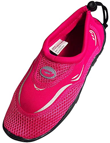 Product DescriptionThe Wave - Ladies Aqua Shoe, Raspberry, Neoprene and Mesh Panels, Silver Trim, Drawstring at Ankle with Adjustable Toggle, Rugged Rubber Sole, All Man Made Materials, Made in China, #37106 37-1060
