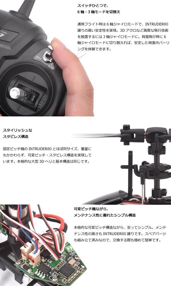 | セット内容 | INTRUDER 80 V2本体 LiPoバッテリー 工具(プラスドライバー・六角レンチ) 予備パーツ (ローターブレード・テールブレード・スクリューセット・リンケージ・グロメット) USB充電用ケーブル・充電器 日本語取扱説明書 |
