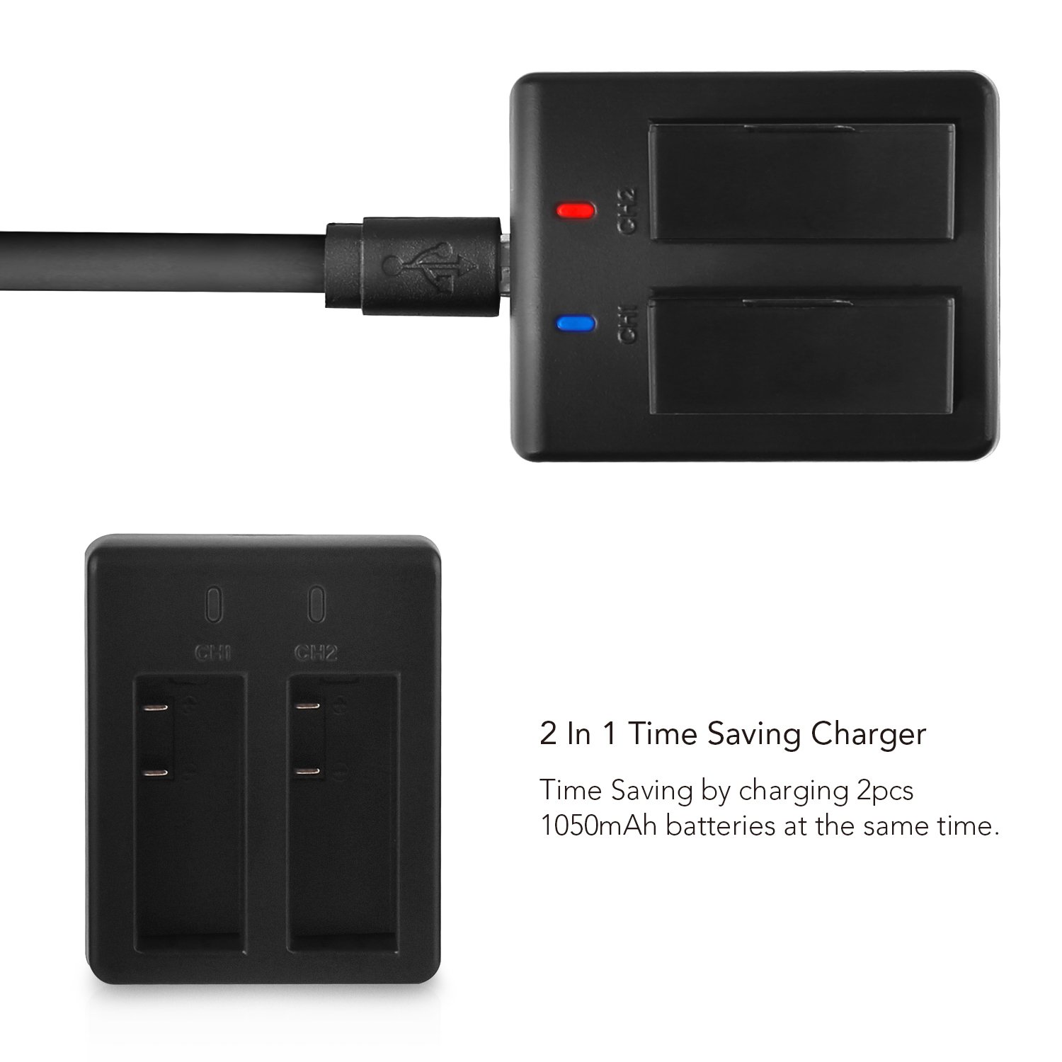 It can charge two 1050 mAh batteries at once with a rapid dual charger.