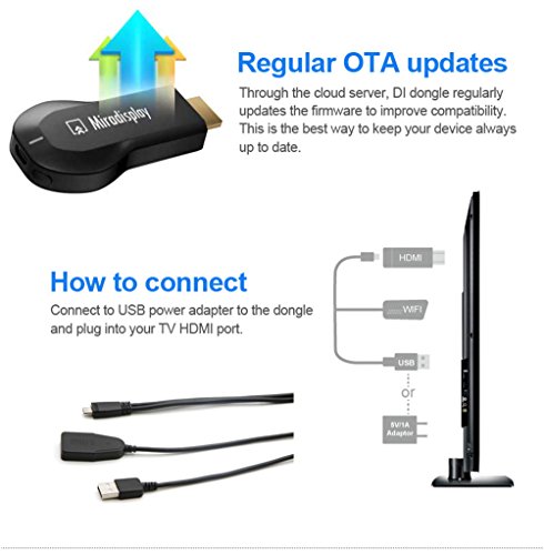 -. Feature : This is a wifi hdmi dongle, you can connect it to any TV's HDMI, supply power by TV's USB, then your mobile ( Apple or any Andriod phone ) can find a hot spot, connect the spot, then you can mirror anything from your phone to TV, including pictures, vedios, games and anything, mirror completely. Support HDCP upto 1.2 / Wireless interconnection, sync cast photo / video / music / office file / web browser / live camera from iPhone / Android smartphone / tablet PC to large screen TV / Projector, perfect for PPT presentation and video meeting / Support HDMI 1920x1080P full HD output. With OTA chip, support upgrade online. Mini, small-size, lightweight, convenient for travel / Support EZCast, DLNA, Miracast, EZAir (Airpaly), multi-screen interactive by pushing only one button. You can make colorful notes on the photo / Word / Excel / PPT / PDF / Website, whether you save it or not / Note: Apple devices and Android smartphone / tablet PC / laptop must support Miracast, DLNA or Airplay.Built-in wifi module, support WiFi 802.11 b/g/n, strong anti-jamming capability