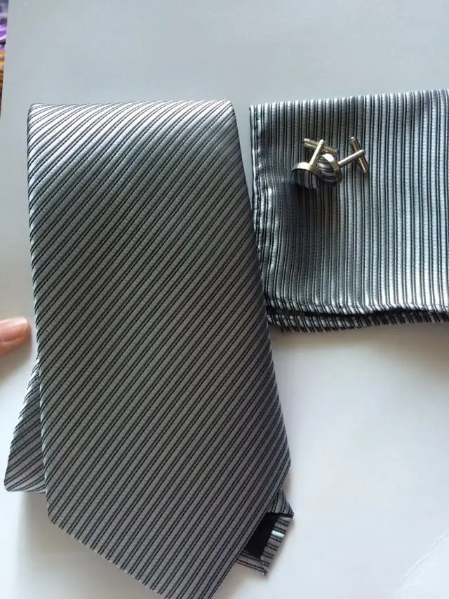 상품 내용 목에 넥타이 세트 = 타이 + 손수건 + 커프스 넥타이 크기: 145 센치메터 길이, 10 센치메터 폭 손수건 크기: 22*22 센치메터 실제 사진