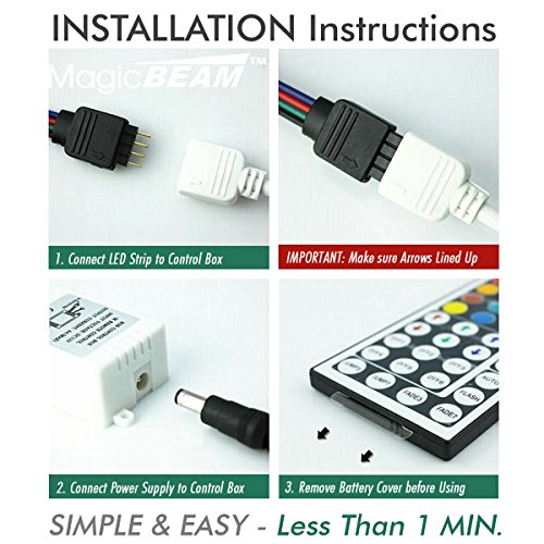 SATISFACTION GUARANTEE - We ensure you're 100% satisfied with our products. 30-Day Money Back Guarantee. Please don't add more strip lights than what we have in the package. Be sure to remove battery plastic cover on Remote Control before use.