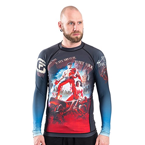 The classic 1992 poster featuring the Chin fiercely battling off the undead with his signature chainsaw attached to his hand is printed on the front of this BJJ rashguard