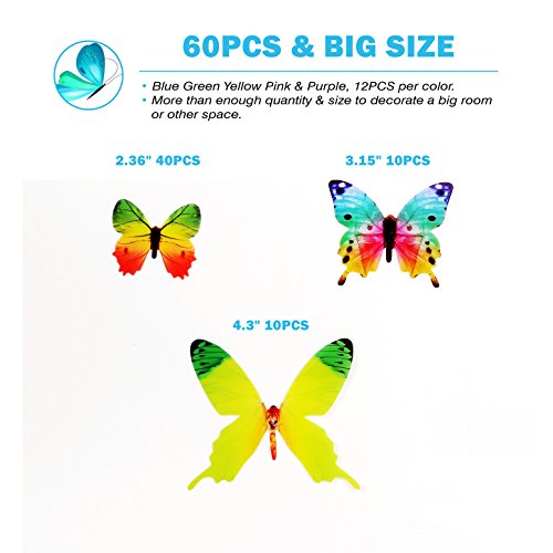 -. Feature : NEW DESIGN: Classic 5-Color Butterfly Wall Stickers, New Shape, New Pattern, Make You To Be Proudly Showed off Your Create. / MORE SUITABLE AS GIFT: 60pcs Colorful Butterflies in A Beautiful Box, It Is More Suitable as A Gift for Your Kids, Friends, Relatives Or Other People. / VIVID 3D STYLE: This Set Will Give You The Quality Look of Colorful Real Butterflies on Your Walls or Other Surface.