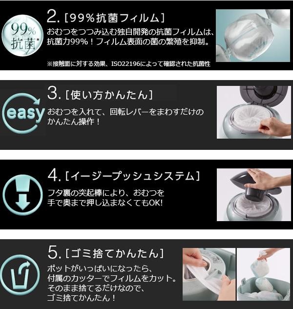 おむつ1つずつニオイごとくるんで密封するので、フタを開けてもにおわないおむつ処理ポット。リビングにも置けるスタイリッシュなデザイン。99%抗菌(※)フィルムカセット1個付き。※接触面に対する効果:ISO22196によって確認された抗菌性 |