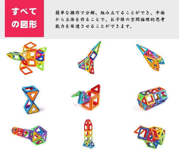 간단한 조작으로 분해, 조립가능, 평면에서 입체로 만들수 있고, 공간 논리적 사고 능력을 발달시킬 수 있습니다.이차원의 도형뿐만 아니라삼차원적인 구조도 더 간단히 만들수있습니다.즐거운 공부를 시작할 수 있습니다.