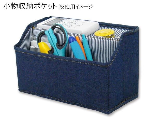 テーブル上でごちゃつきやすいティッシュやリモコン、文房具、モバイルなどをまとめて収納できるスタンドボックス。ティッシュは小物収納ポケットの裏側に収納できます。フェイクゴールドの色糸を使用した縫い目とストライプの生地がポイントです。 |