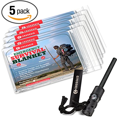 Crossaid Emergency Survival Kit 2 in 1 Mylar Thermal Blankets and Magnesium Survival Fire Starter with Compass and Whistle